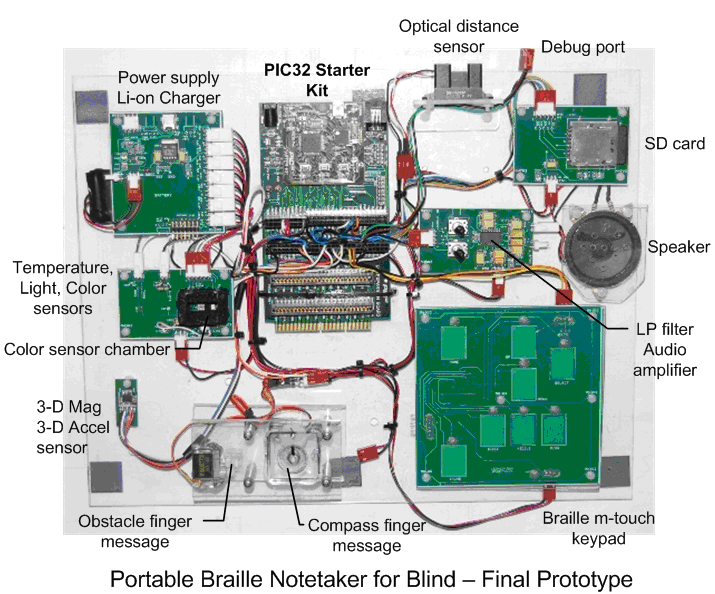 Đề tài Sổ Tay Điện Tử Cho Người Mù Tác giả: Trần Xuân Nghĩa Bài thi thiết kế quốc tế xử dụng chíp 32-bít của Microchip (www.microchip.com) Thời gian: 2008-2009 Giới Thiệu Một cách viết quan trọng của người mù là dùng kim xâm xuống giấy những chấm chữ nổi Braille, và các chữ này được đọc lại bằng cách chạm và cảm giác ở đầu ngón lên trên phần chữ nổi ở mặt kia của giấy. Cách này đơn giản ít tốn kém và còn là một phương tiện ghi chú học tập thuận tiện tốt cho nhiều người ở các nước chưa phát triển. Tuy nhiên có khá nhiều vấn đề. Cách viết này chậm và chiếm khoản giấy lớn. Bàn tay dễ bị mỏi do dùng lực ấn kim xuống giấy. Các chấm nổi không dễ đọc lại bằng cảm giác. Nó còn khó cho người mù học giữ kim ghim thẳng đứng khi viết. Cách viết này không thuận tiện để sao chép chỉnh sửa và truyền đạt cho người khác. Do đó cách viết này làm giới hạn khả năng truyền đạt ngôn ngữ và trao đổi thông tin của người mù với người khác. Có một số loại đánh máy dùng điện ngoài thị trường nhưng kích thước nó rất lớn và đắt tiền. Dự án này nhằm làm một máy gọn nhỏ, bỏ túi, rẻ tiền cho người mù. Người dùng (người mù) có thể nhập các nghi chú học tập và bài vở qua một bàn phiếm cảm ứng dùng bộ chữ Braille của người mù. Bộ xử lý bên trong máy sẽ chuyển các chữ này thành chữ thường abc và chứa trong bộ nhớ. Bộ xử lý sẽ chuyển dữ liệu từ dạng chữ sang dạng tiếng nói phát ra ở loa khi người dùng cần nghe. Thêm vào đó là chức năng nói âm thanh báo giờ, lịch trình, cho biết nhiệt độ ánh sáng môi trường. Nó có chức năng nhận và nói ra màu sắc của vật muốn biết. Nó còn làm một máy nghe nhạc, thâu lại giọng nói, và là bộ lưu trữ dữ liệu, tập tin. Một đặc tính đặc biệt được tích hợp trong sổ tay điện tử là gậy ảo giúp người mù định hướng đi và biết chướng ngại vật trên đường đi. Gậy ảo hoạt động nhờ các cảm biến đo khoảng cách, đo từ trường và gia tốc, và một bộ báo tin qua cảm giác ngón tay. Cảm biết đo khoảng cách cho biết khoảng các từ người dùng đến vật cản. Kết hợp của cảm ứng từ trường và gia tốc cho biết dữ kiện về độ nghiêng và hướng đi (như kim chỉ la bàn), và dữ kiện này được báo cho người dùng biết qua cảm giác ở ngón tay. Hình dưới bên trái là thiết mẫu để thử nghiệm. Hình bên phải là mô hình máy sổ tay điện tử cho người mù có thể được thực hiện trong tương lai. Toàn bộ chi tiết thiết kế có ở trên trang web dự thi www.mypic32.com http://dientuvietnam.net/forums/atta...1&d=1237739048http://dientuvietnam.net/forums/atta...1&d=1237739048 |