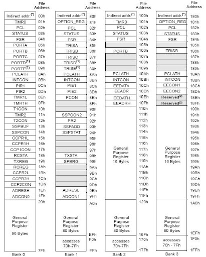 ![]() 2 bit này chia toàn bộ vùng nhớ ra làm 4 bank tương ứng với giá trị của nó. Vậy có nghĩa là với 7 bit địa chỉ kia, nếu giả sử có giá trị là 0x0D, [Xem hình nhé] với 2 bit RP1:RP01 = 00 thì bạn đang truy xuất đến thanh ghi PIR2, còn RP1:RP0 = 01, thì bạn đang truy xuất đến PIE2, còn RP1:RP0 = 10 thì bạn đang truy xuất đến EEADR, tương tự "11" thì truy xuất đến EECON2. Bạn yên tâm là cho dù RP1:RP0 có bằng bao nhiêu đi nữa thì việc truy xuất đến các thanh ghi STATUS, PCL, FSR, PCLATH, INTCON đều được cả, nhìn hình là rõ ngay thôi. Còn về truy xuất địa chỉ gián tiếp thì dùng thanh ghi FSR thì bạn quan tâm đến bit IRP của thanh ghi STATUS, nếu là 0 thì 8 bit của FSR trỏ đến 256 byte của 2 bank đầu là bank 0 và bank1, nếu IRP là 1 thì FSR trỏ đến 256 byte của 2 bank sau. [Xem hình nhé] ![]() |